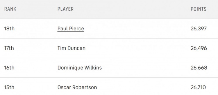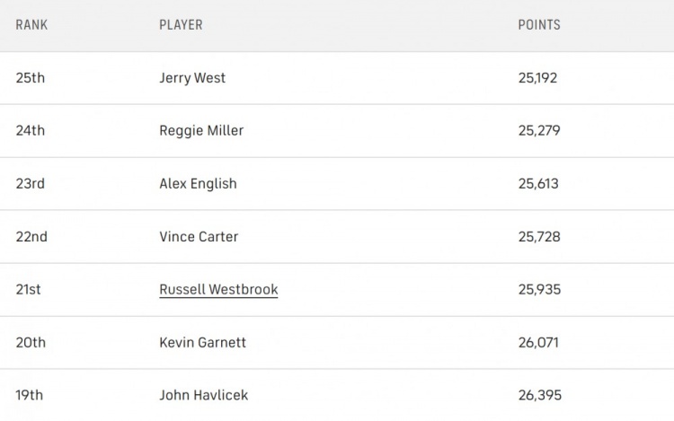 這是一個總得分非常接近的群體,而且這些球員都已退役,因此我們不需要擔心積分差距發(fā)生變化。庫里需要再得到1694分才能超越奧斯卡-羅伯特森并進入前15名。這同樣是一個幾乎確定能達成的目標,甚至有可能在下賽季就實現(xiàn),只要庫里沒有長時間缺席。本賽季庫里的場均得分是威少的兩倍,即使威少目前總得分更高,庫里也有很大機會先于他超越羅伯特森。