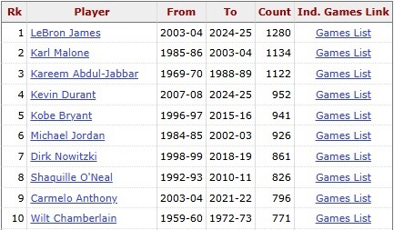 這是杜蘭特常規(guī)賽生涯第953場(chǎng)單場(chǎng)20+,同樣排在歷史第四,僅次于詹姆斯(1280)、卡爾-馬龍(1134)和賈巴爾(1122)。
