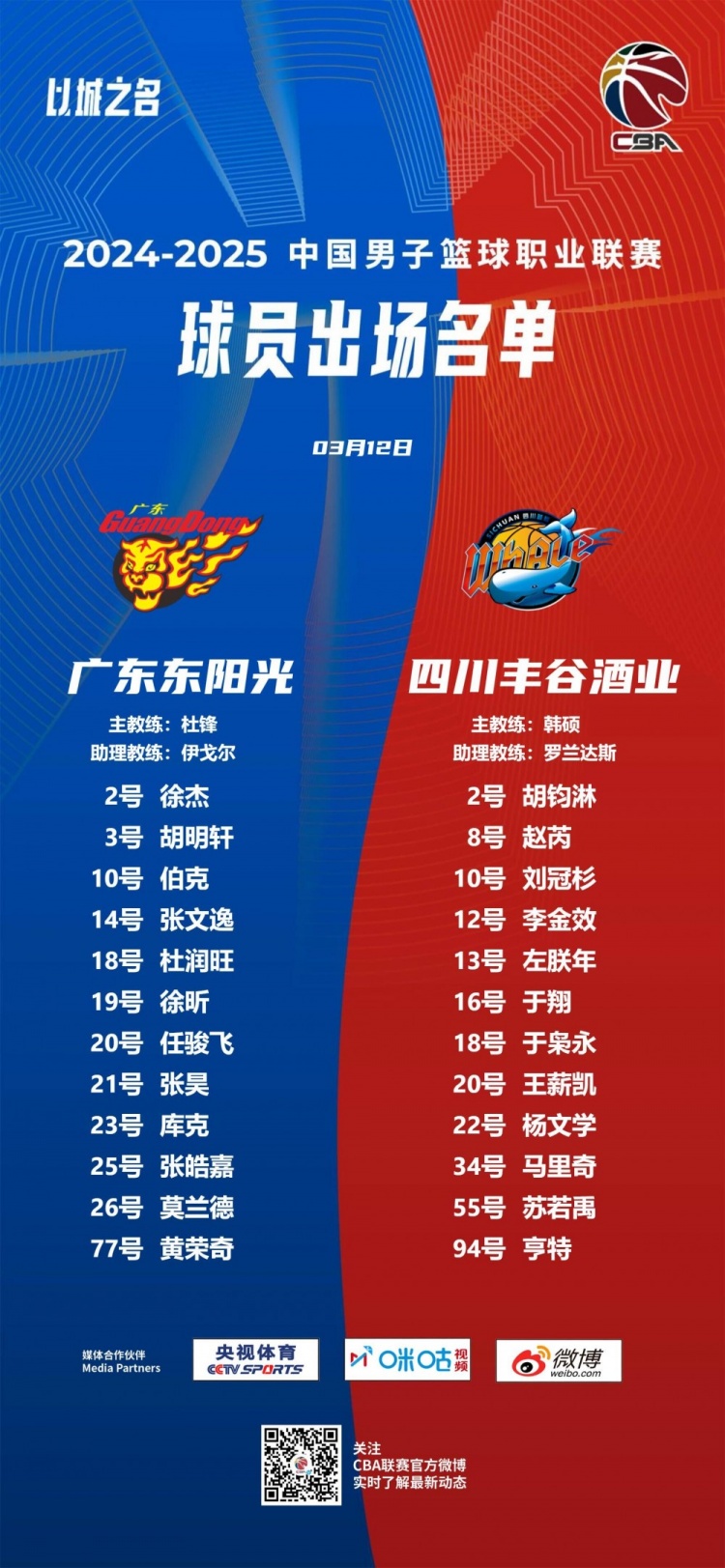 2025-03-13 00:37:29廣東VS四川大名單:廣東三外援領(lǐng)銜 四川薩姆納缺戰(zhàn)