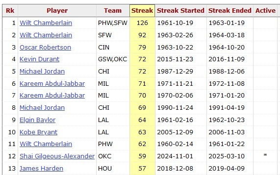 2025-03-13 17:10:40亞歷山大成NBA歷史第8位連續(xù)60場砍20+球員 比肩大帥喬丹科比KD