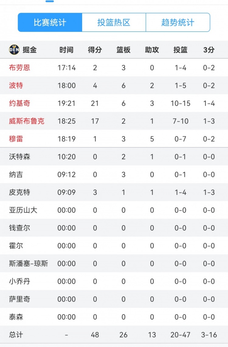 2025-03-13 17:13:05都是臥底?掘金全隊(duì)除約基奇和威少外合計(jì)22投3中 穆雷7中0