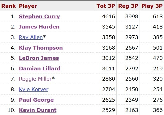 本場比賽過后,庫里生涯(常規(guī)賽+季后賽)的三分命中數(shù)來到4618記,距離5000記還有382記。