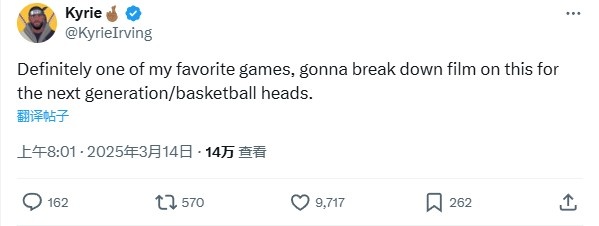 2025-03-14 20:47:25籃網(wǎng)時期單核帶隊砍54分!歐文回復(fù)美媒:這是我最喜歡的比賽之一