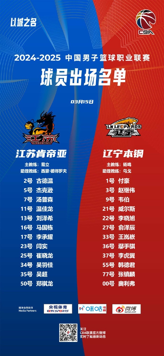 2025-03-15 20:55:58遼寧VS江蘇大名單:弗格缺陣 趙繼偉&張鎮(zhèn)麟領(lǐng)銜 俞澤辰在列