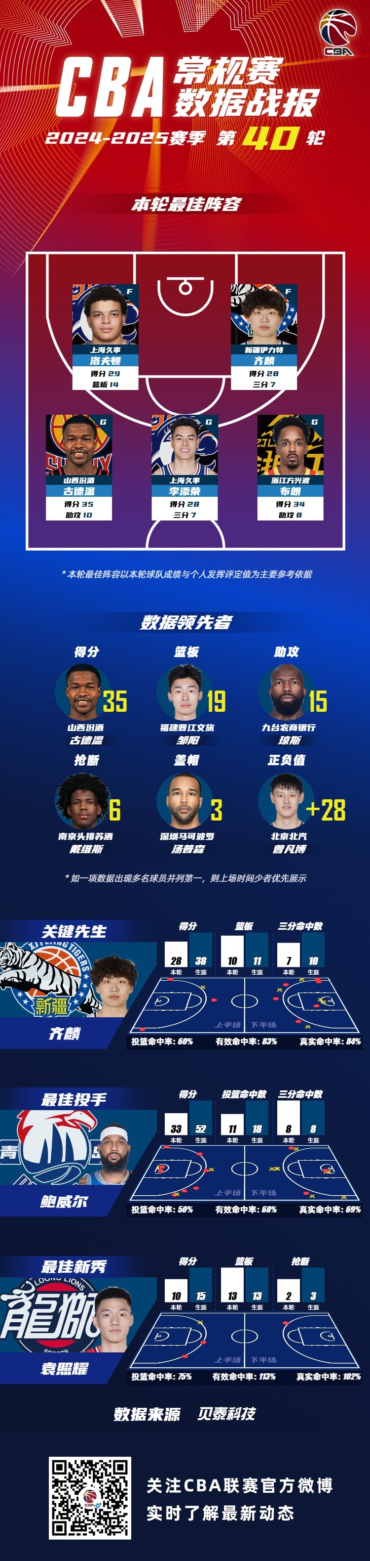 2024-2025賽季CBA聯(lián)賽常規(guī)賽第40輪結(jié)束較量,來自上海久事大鯊魚的洛夫頓和李添榮,新疆廣匯籃球俱樂部的齊麟,山西汾酒職業(yè)籃球俱樂部的古德溫和浙江廣廈籃球俱樂部的布朗入選CBA聯(lián)賽常規(guī)賽第40輪最佳陣容!