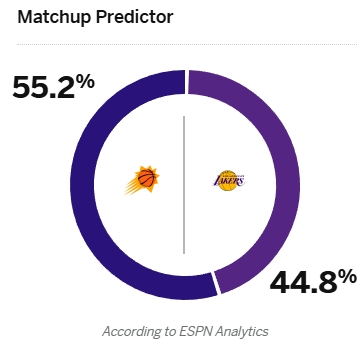 2025-03-16 22:26:13老詹缺陣&77大概率打!ESPN預(yù)測湖vs日勝率:湖人44.8% 太陽55.2%