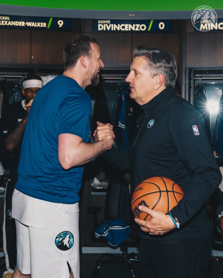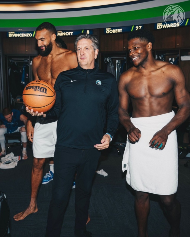 2025-03-17 10:47:34森林狼更衣室祝賀芬奇200勝:拿到比賽用球 華子戈貝爾裹浴巾合影
