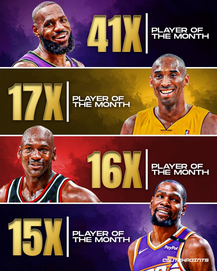 2025-03-17 10:52:27詹姆斯41次月最佳歷史斷檔第一 科比17次第二 喬丹16第三KD15第四