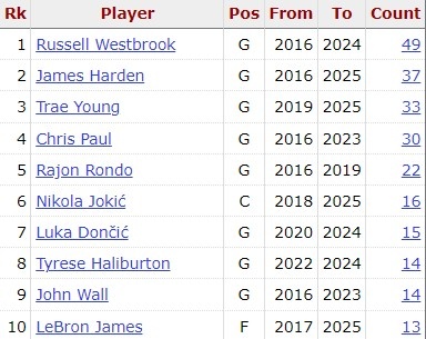 2025-03-18 18:24:36威少過(guò)去10個(gè)賽季50次半場(chǎng)助攻上雙 同期最多 哈登37次第二