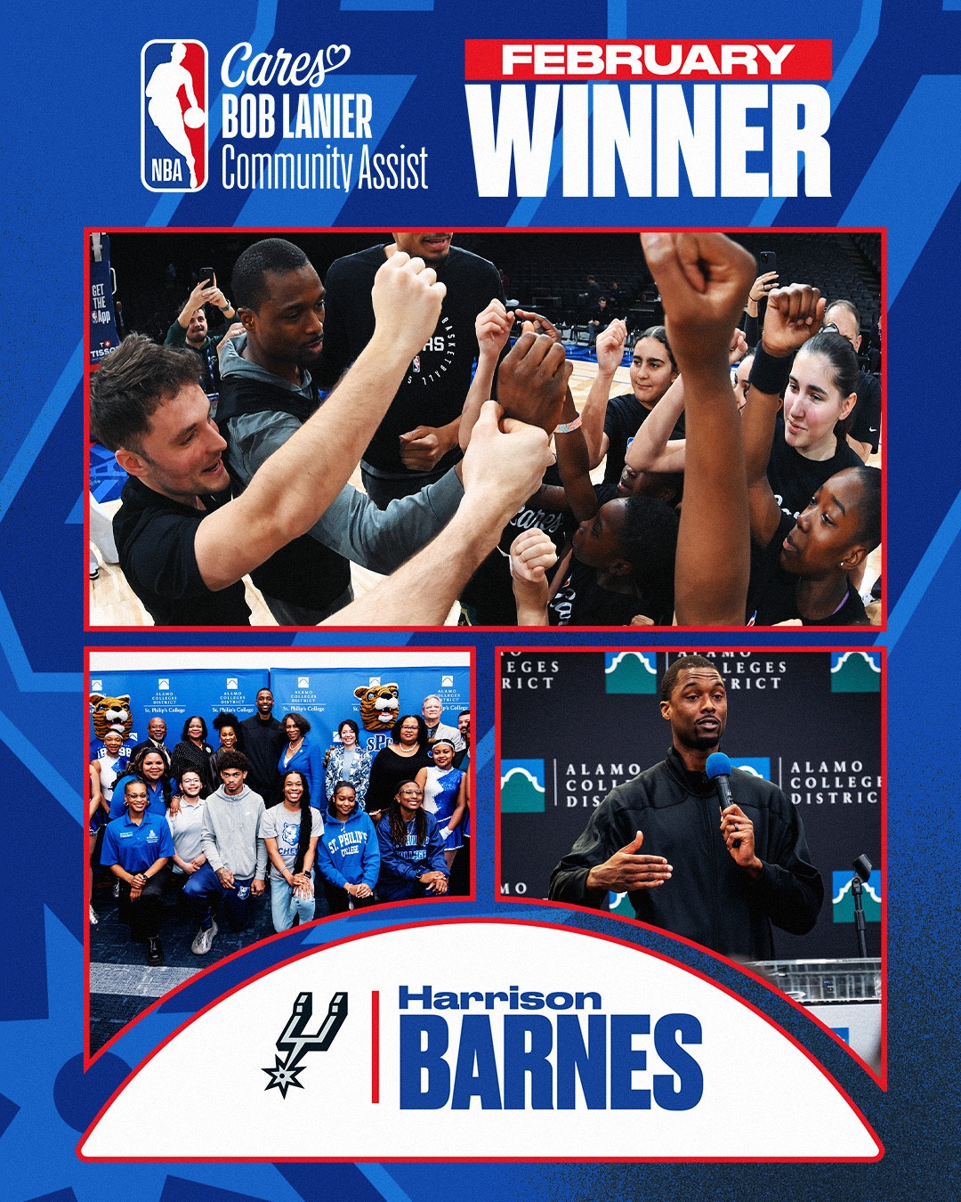 圣安東尼奧馬刺隊(duì)前鋒哈里森-巴恩斯被評(píng)為2月份的NBA“鮑勃-蘭尼爾”社區(qū)關(guān)懷援助獎(jiǎng)(Bob Lanier Community Assist Award)得主。巴恩斯和他的妻子布列塔尼向阿拉莫承諾項(xiàng)目(AlamoPROMISE)捐贈(zèng)了25萬美元,該項(xiàng)目為符合條件的貝薩縣學(xué)生支付學(xué)費(fèi)和雜費(fèi)。