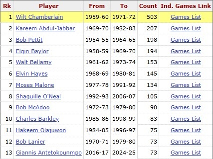 2025-03-23 21:30:05字母哥第222場(chǎng)比賽30+10板 現(xiàn)役斷檔領(lǐng)先 濃眉第2 詹姆斯第3