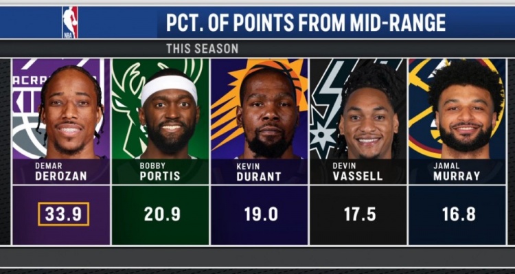 2025-03-23 21:41:43經(jīng)典永不過時!本賽季中距離得分占比德羅贊33.9%第一&杜蘭特第三