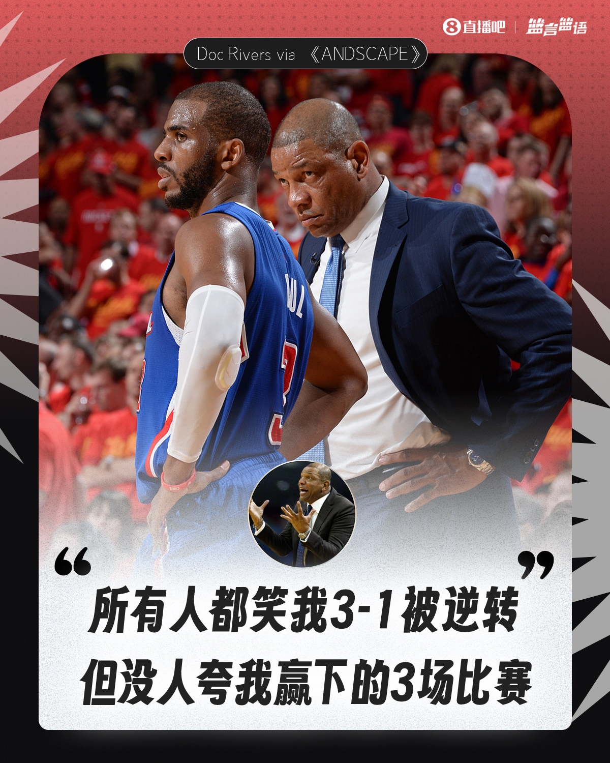 在談到自己飽受詬病的“系列賽多次3比1領(lǐng)先被翻盤(pán)”的話題時(shí),里弗斯坦然表示:“我曾帶領(lǐng)一支排名第8的球隊(duì)3比1領(lǐng)先。在快船的那次是唯一一次讓勝利溜走了,沒(méi)有人講出真實(shí)的故事,沒(méi)人意識(shí)到保羅當(dāng)時(shí)拖著一條傷腿在場(chǎng)上奔跑。這在某種程度上是不公平的,我贏得3場(chǎng)勝利沒(méi)有得到足夠的認(rèn)可,大家只記住了輸?shù)舻谋荣悺N铱偸钦f(shuō),‘如果我們6場(chǎng)內(nèi)輸給火箭會(huì)怎樣?那就沒(méi)人在意了。’”