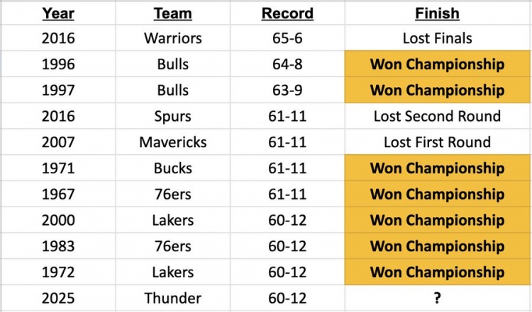2025-03-26 13:46:56雷霆僅用72場(chǎng)就獲60勝&平NBA歷史第八快 第一快是16年勇士的66場(chǎng)