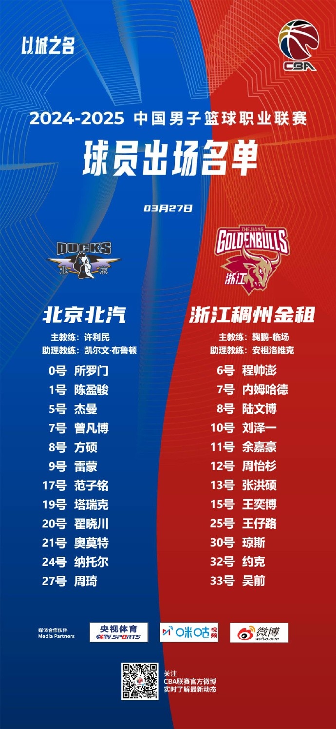 2025-03-27 20:06:11北京VS浙江大名單:周琦曾凡博吳前領銜 陳盈駿程帥澎在列