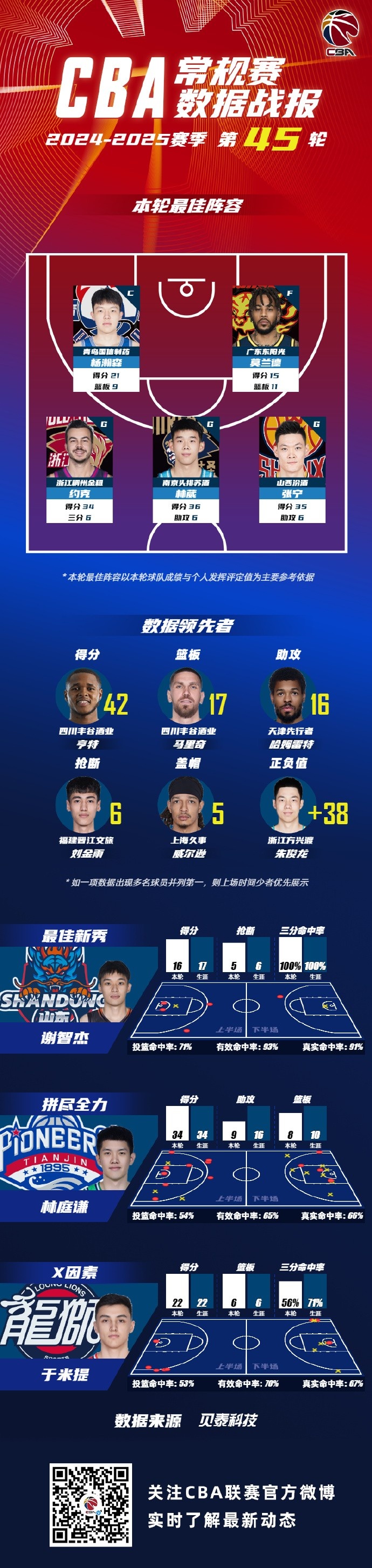 2024-2025賽季CBA聯(lián)賽常規(guī)賽第45輪結(jié)束較量,來自青島國信海天籃球俱樂部的楊瀚森,廣東宏遠(yuǎn)籃球俱樂部的莫蘭德,浙江稠州籃球俱樂部的約克, 南京同曦籃球俱樂部的林葳和山西汾酒職業(yè)籃球俱樂部的張寧入選CBA聯(lián)賽常規(guī)賽第45輪最佳陣容!