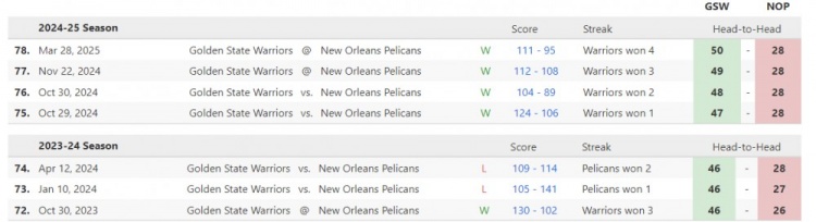 2025-03-29 21:17:58勇士本賽季4-0橫掃鵜鶘 上一次橫掃對方要追溯到2018-19賽季