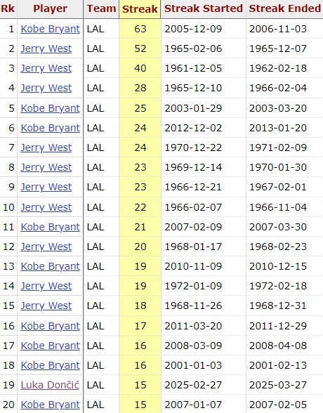 2025-03-30 15:28:31東契奇連續(xù)15場20+ 湖人隊(duì)史后衛(wèi)第3人 比肩科比和韋斯特