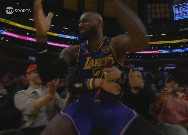 2025-02-26 16:16:06詹姆斯快攻上籃飛出場外摔到場外觀眾席 裁判未響哨&老詹十分不滿