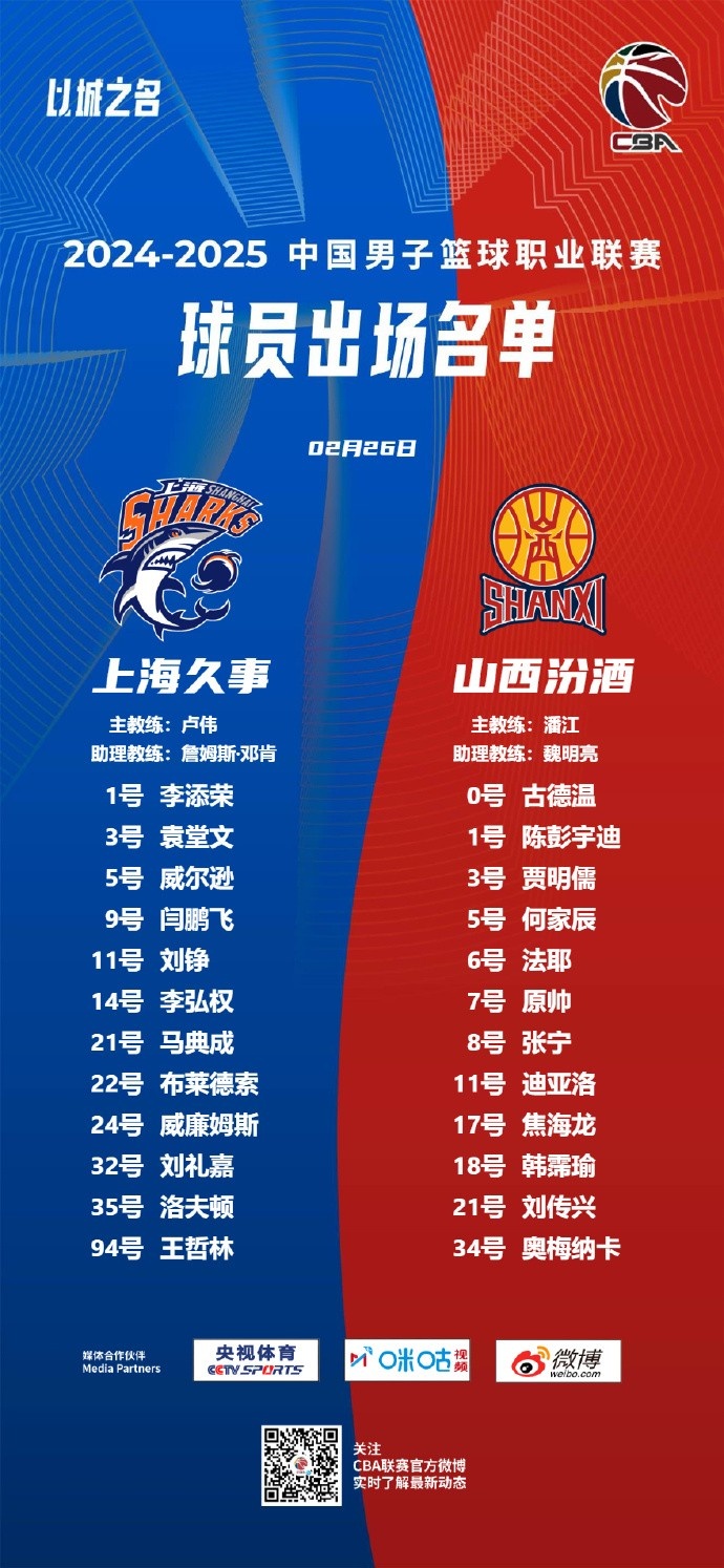 2025-02-26 16:19:44上海VS山西大名單:多諾萬-威廉姆斯首秀 王哲林、張寧在列