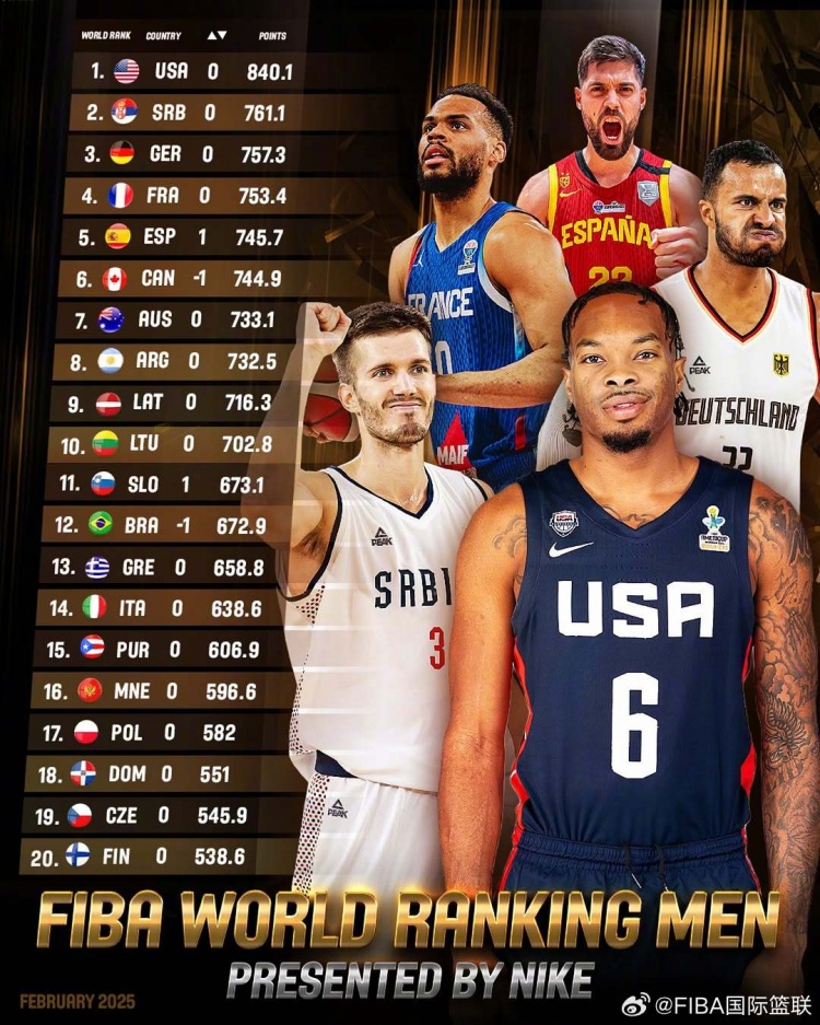2025-03-01 16:24:45男籃最新世界排名:美國領跑 中國隊繼續(xù)位列第30 亞大區(qū)排名第6