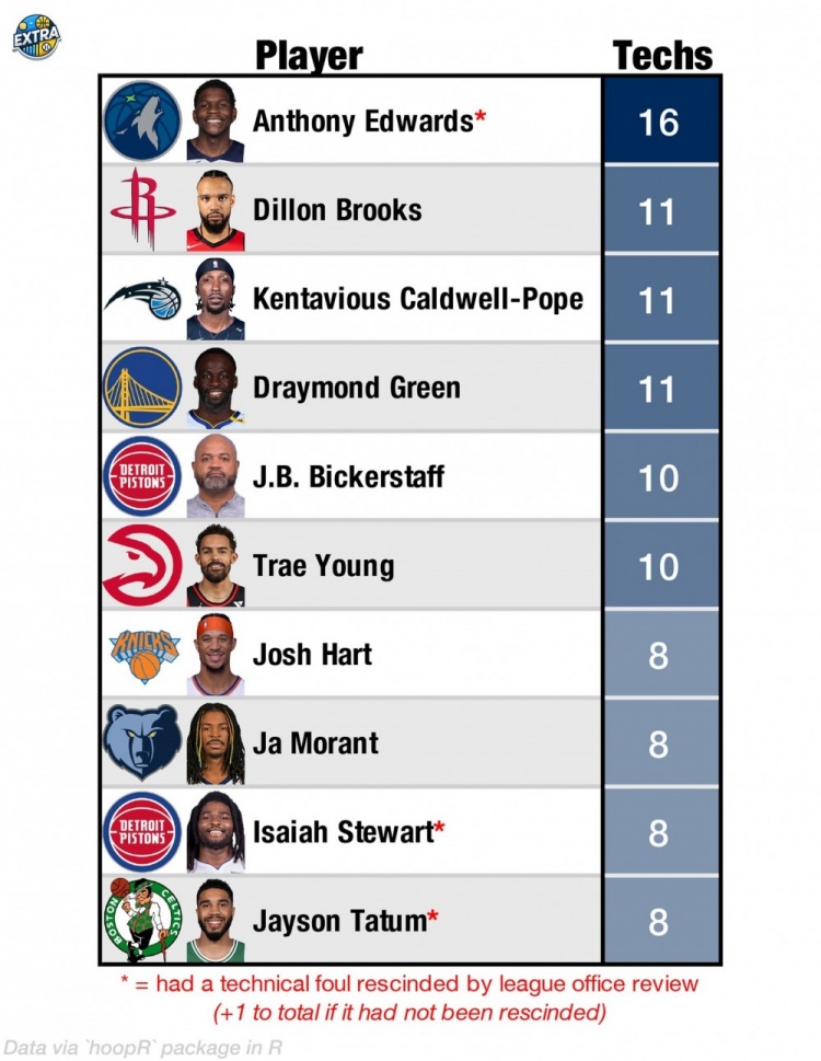 2025-03-01 16:29:53華子16次遭停賽!本賽季技犯榜:狄龍&追夢11次第二 活塞主帥10次