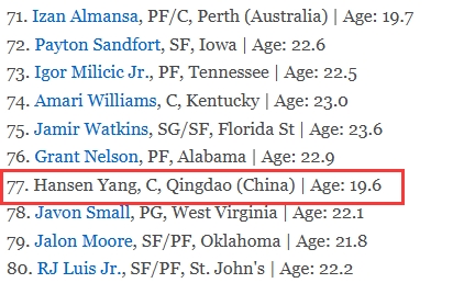 來自CBA青島男籃的楊瀚森排名第77,呈現(xiàn)緩慢上升的趨勢(前兩次ESPN的榜單中,楊瀚森排在第80和第90)。
