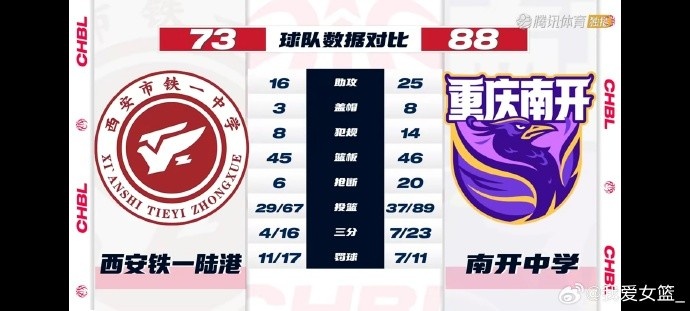 數(shù)據(jù)方面:南開中學(xué)胡馨月15分,汪子涵13分8助攻,王思琪12分12籃板6搶斷,谷滿杰11分9助攻7搶斷。西安鐵一陸港中學(xué)張賀玥19分5籃板,張桐菲18分6籃板,孫子喻11分5籃板。