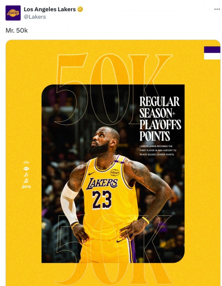 2025-03-05 12:47:44詹姆斯生涯50000分!湖人官方曬照:五萬分先生