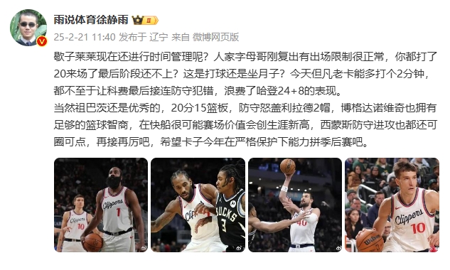 2月21日訊 今日,NBA常規(guī)賽,快船客場(chǎng)110-116不敵雄鹿。賽后,評(píng)論員徐靜雨對(duì)本場(chǎng)比賽作出點(diǎn)評(píng)。