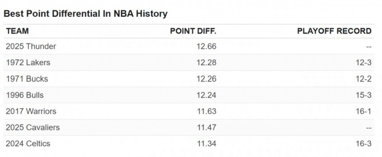 (圖為NBA歷史上的最高凈勝分紀(jì)錄,第一列為球隊(duì),第二列為場(chǎng)均凈勝分,第三列為季后賽戰(zhàn)績(jī))