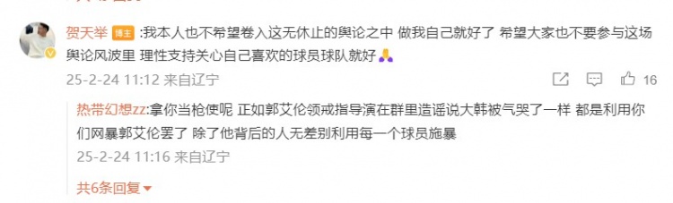 之后,賀天舉還在這條動(dòng)態(tài)的評(píng)論區(qū)寫(xiě)道:“我本人也不希望卷入這無(wú)休止的輿論之中 做我自己就好了 希望大家也不要參與這場(chǎng)輿論風(fēng)波里 理性支持關(guān)心自己喜歡的球員球隊(duì)就好????”