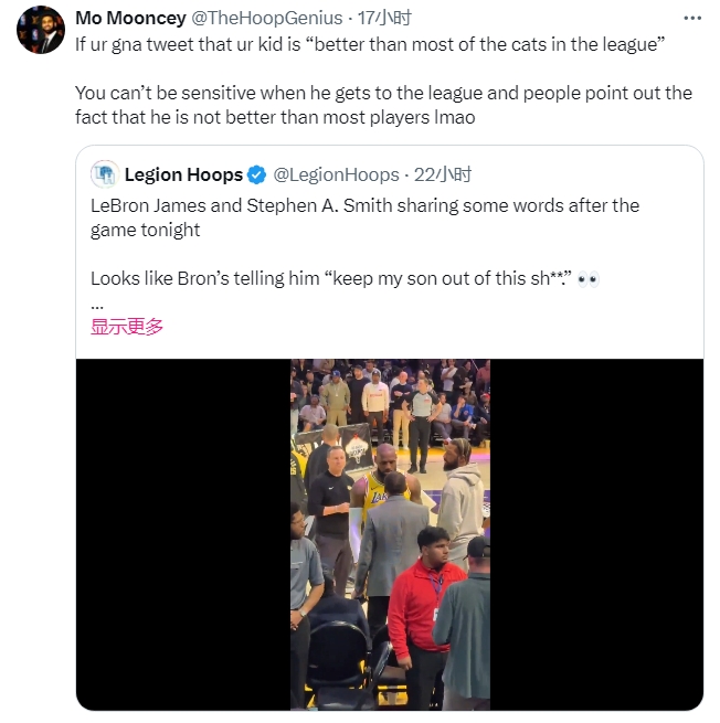 賽后,詹姆斯找到A史密斯對峙,詹姆斯表示:“老子不在乎,兄弟!不要把我兒子扯進(jìn)來,兄弟!”