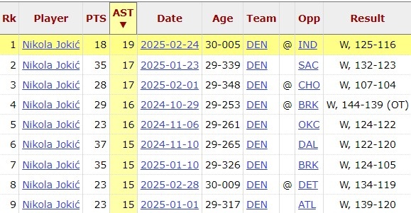 2025-03-08 21:24:35約基奇本賽季第10場比賽送出15+助攻 10戰(zhàn)全勝