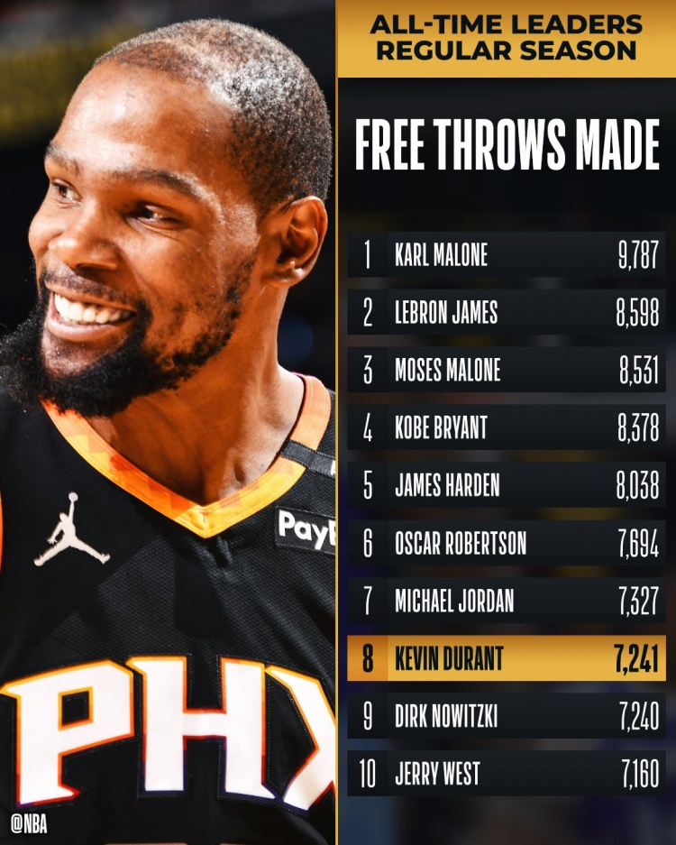 2025-03-10 10:59:40?KD常規(guī)賽罰球命中數(shù)達(dá)到7241次 超越諾維茨基升至歷史第8!