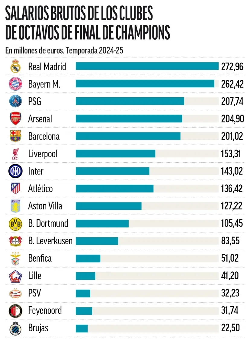 盡管經(jīng)濟(jì)實(shí)力并不一定保證競(jìng)技成功——過(guò)去十年曼聯(lián)便是例證——但財(cái)務(wù)差距顯而易見(jiàn)。八強(qiáng)俱樂(lè)部的平均年薪支出為1.298億歐元,但最高支出者皇馬(2.729億歐元)與最低支出者布魯日(2250萬(wàn)歐元)之間的差距達(dá)到12比1。
