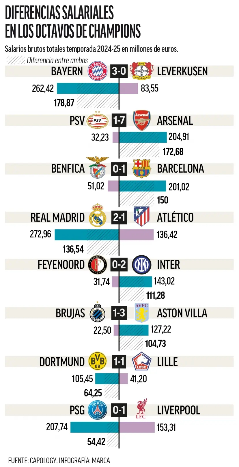 根據(jù)足球財(cái)務(wù)專(zhuān)業(yè)網(wǎng)站Capology的數(shù)據(jù),如果以球員薪資支出為標(biāo)準(zhǔn),最不平衡的淘汰賽是對(duì)陣拜仁和勒沃庫(kù)森的比賽,拜仁的薪資支出幾乎是對(duì)手的三倍(2.624億歐元對(duì)8350萬(wàn)歐元)。第二大差距出現(xiàn)在阿森納與埃因霍溫的對(duì)決中,阿森納球員的2.049億歐元薪資遠(yuǎn)超埃因霍溫的3220萬(wàn)歐元,差距高達(dá)六倍。第三個(gè)薪資差距較大的對(duì)決是本菲卡與巴塞羅那,巴薩球員的薪水是葡萄牙球隊(duì)的四倍(2.01億歐元對(duì)5100萬(wàn)歐元)。皇馬與馬競(jìng)的陣容薪資差距恰好是兩倍,皇馬為2.729億歐元,馬競(jìng)為1.364億歐元。