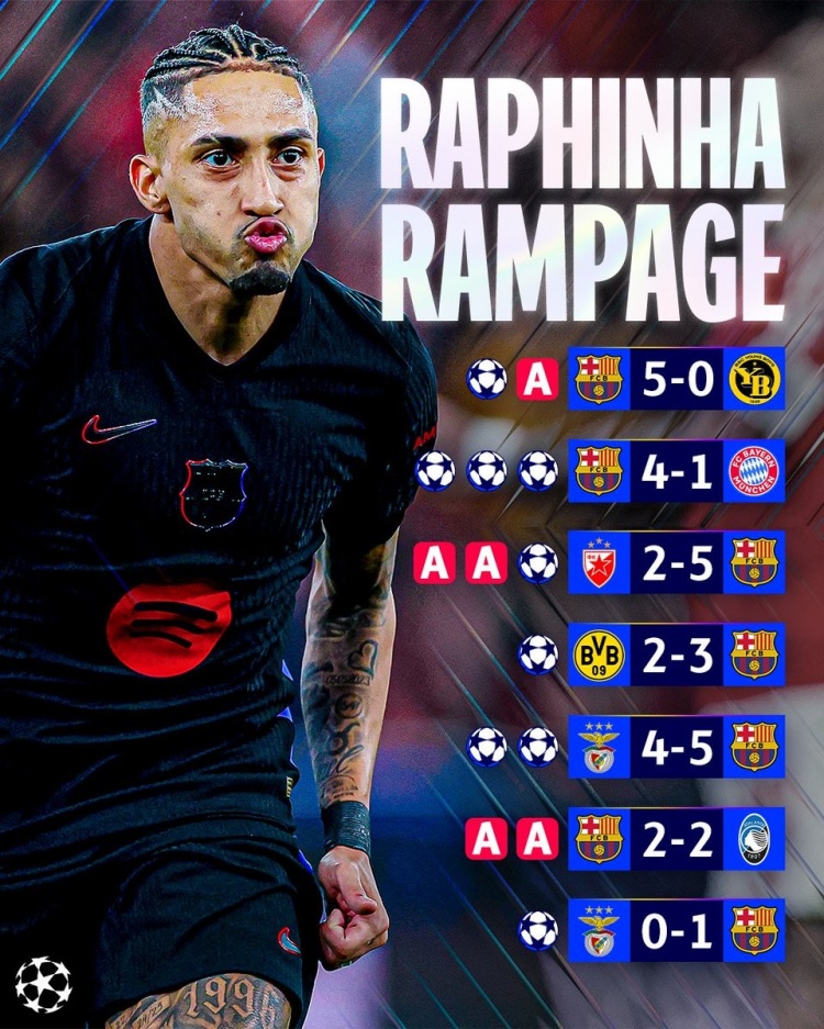 2025-03-11 23:27:50拉菲尼亞本賽季9場(chǎng)歐冠有7次參與進(jìn)球,共計(jì)9球5助攻&戰(zhàn)拜仁戴帽