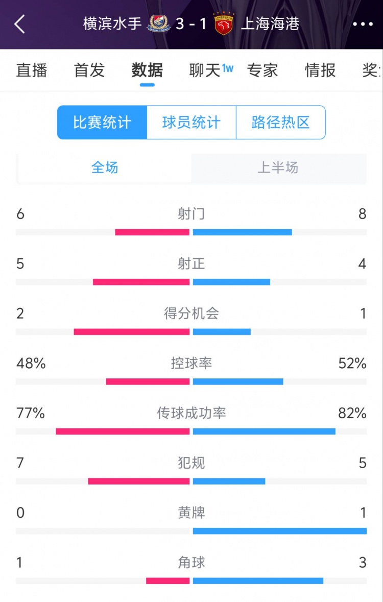 2025-03-11 23:33:22半場(chǎng)數(shù)據(jù):海港射門(mén)8-6領(lǐng)先&射正4-5 控球率傳球成功率均高于橫濱