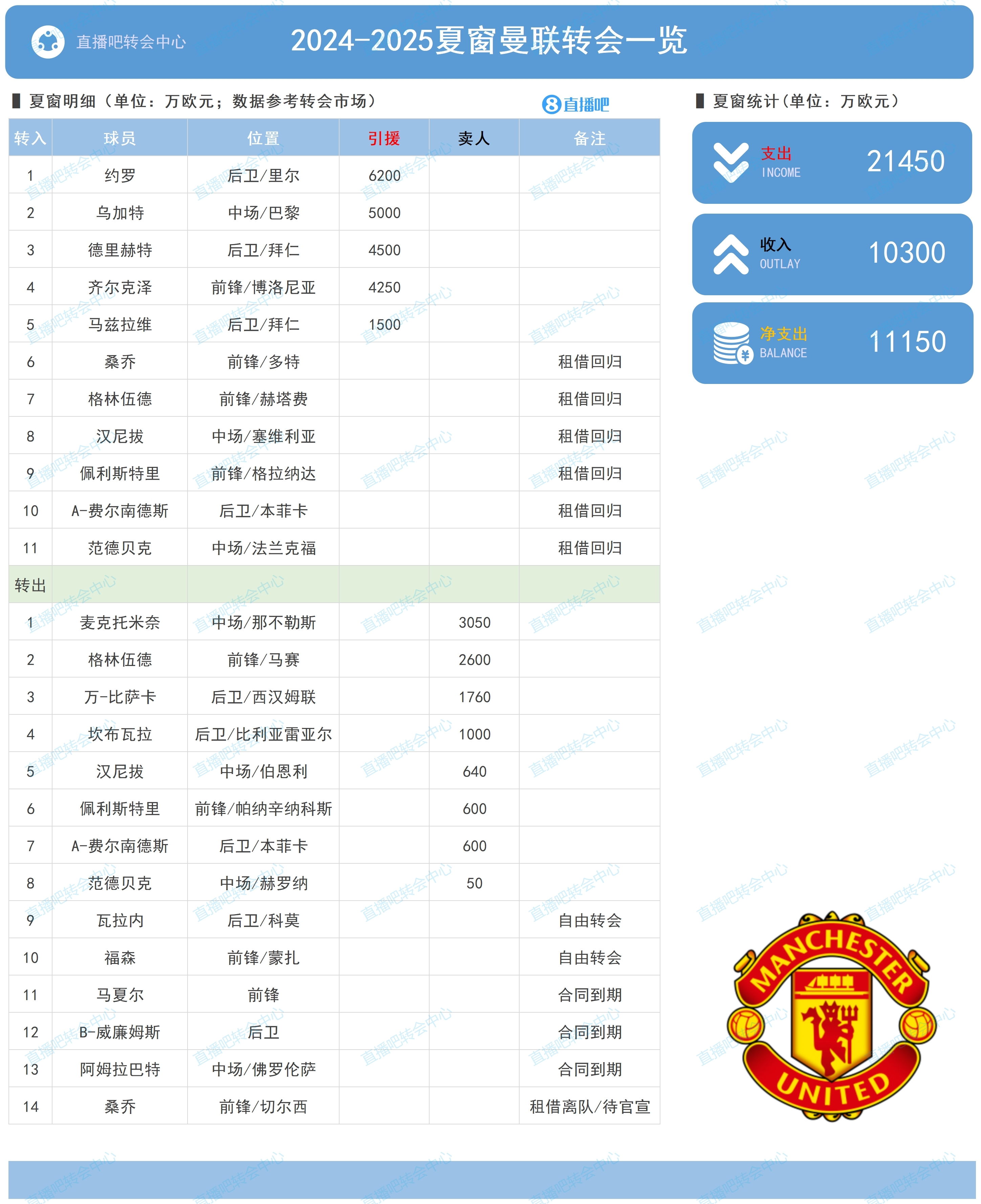 曼聯(lián)去年夏天引援如圖,荷蘭球員有德里赫特(4500萬(wàn)歐)和齊爾克澤(4250萬(wàn)歐)。