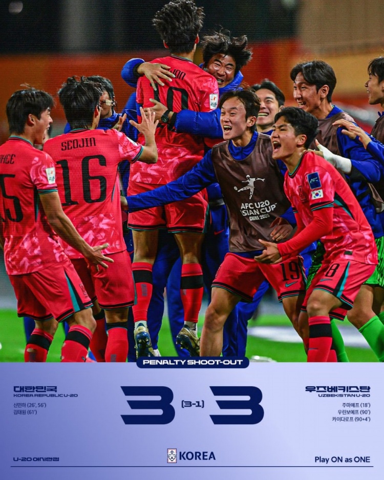 U20亞洲杯1/4決賽,韓國3-1烏茲別克斯坦,晉級(jí)四強(qiáng)。上半場,洪成民送點(diǎn)又撲點(diǎn),阿西爾別克破門,申民河撿漏扳平;下半場,申民河頭球雙響,金泰元勺子進(jìn)球,穆罕默德扳回一球,阿布杜加富爾絕平;點(diǎn)球大戰(zhàn),烏茲別克斯坦前4輪僅罰進(jìn)1球,韓國5輪有3人命中。