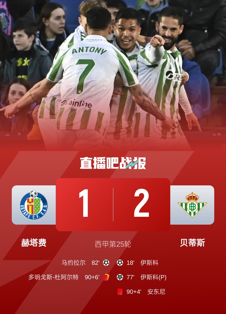 絕對焦點(diǎn)!安東尼奔襲獻(xiàn)助攻+背后鏟人直紅 貝蒂斯2-1赫塔費(fèi)升第7