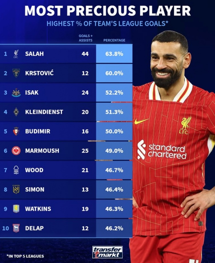 2025-03-11 23:48:39本賽季參與全隊進球比率:薩拉赫63.8%居首,伊薩克&馬爾穆什在列