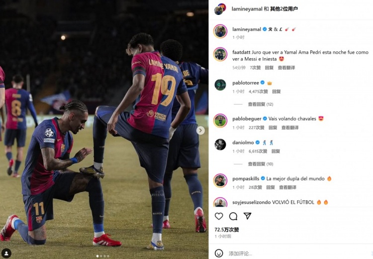 2025-03-12 07:57:49起飛!巴薩兩大邊鋒社媒互動,同時曬出拉菲尼亞為亞馬爾擦鞋照