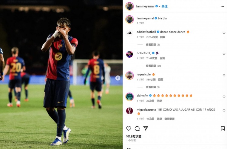 亞馬爾還通過社媒曬出自己的慶祝照,并配文:“bla bla”,似乎是在回?fù)艚趯λ馁|(zhì)疑。
