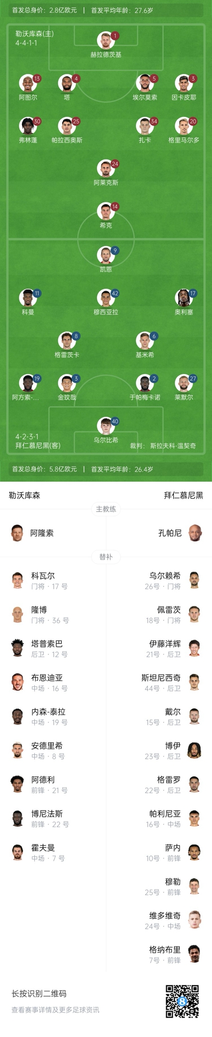 勒沃庫(kù)森首發(fā):1-赫拉德斯基、4-塔、5-埃爾莫索、3-因卡皮耶、13-阿圖爾、34-扎卡、25-帕拉西奧斯、30-弗林蓬、20-格里馬爾多、24-阿萊克斯-加西亞、14-希克