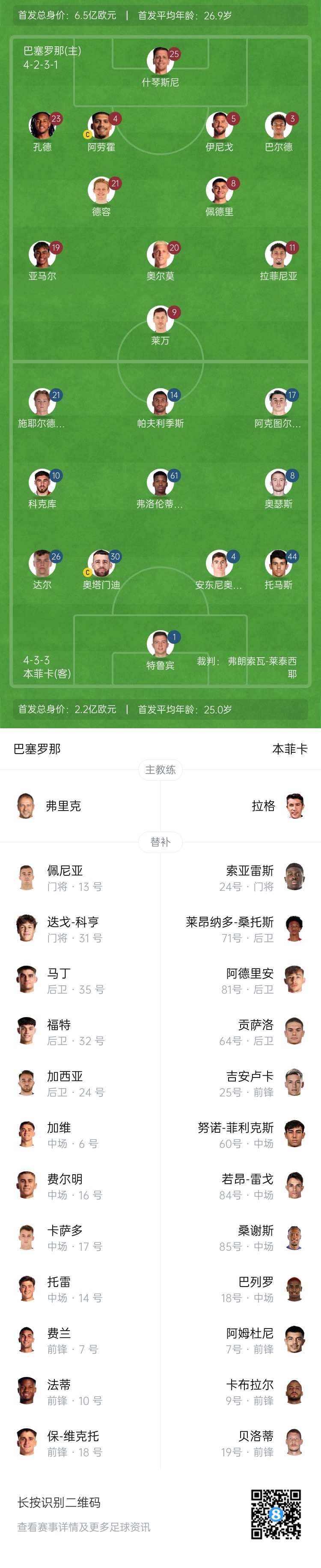 2025-03-12 08:07:46巴薩vs本菲卡首發(fā):萊萬(wàn)、拉菲尼亞、亞馬爾先發(fā),奧爾莫出戰(zhàn)