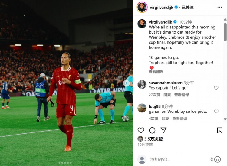 2025-03-12 21:30:00范迪克社媒鼓勵球隊:賽季還剩10場比賽,還要為冠軍而拼搏!