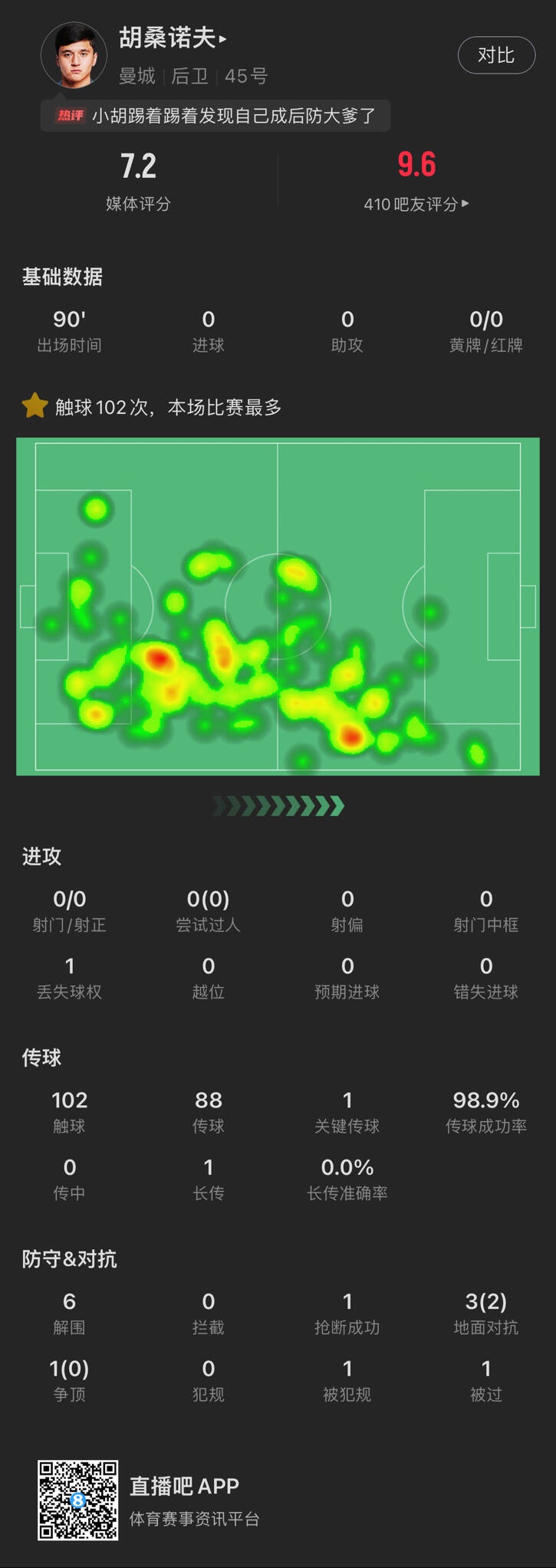2025-02-24 16:11:12胡桑諾夫數(shù)據(jù):傳球成功率98.9% 6次解圍 媒體評分7.2分