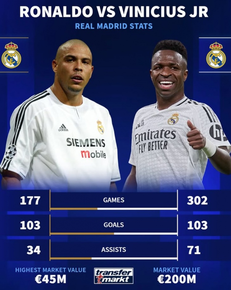 2025-03-13 07:00:34已是傳奇!大羅皇馬生涯177場(chǎng)103球34助,維尼修斯302場(chǎng)103球71助